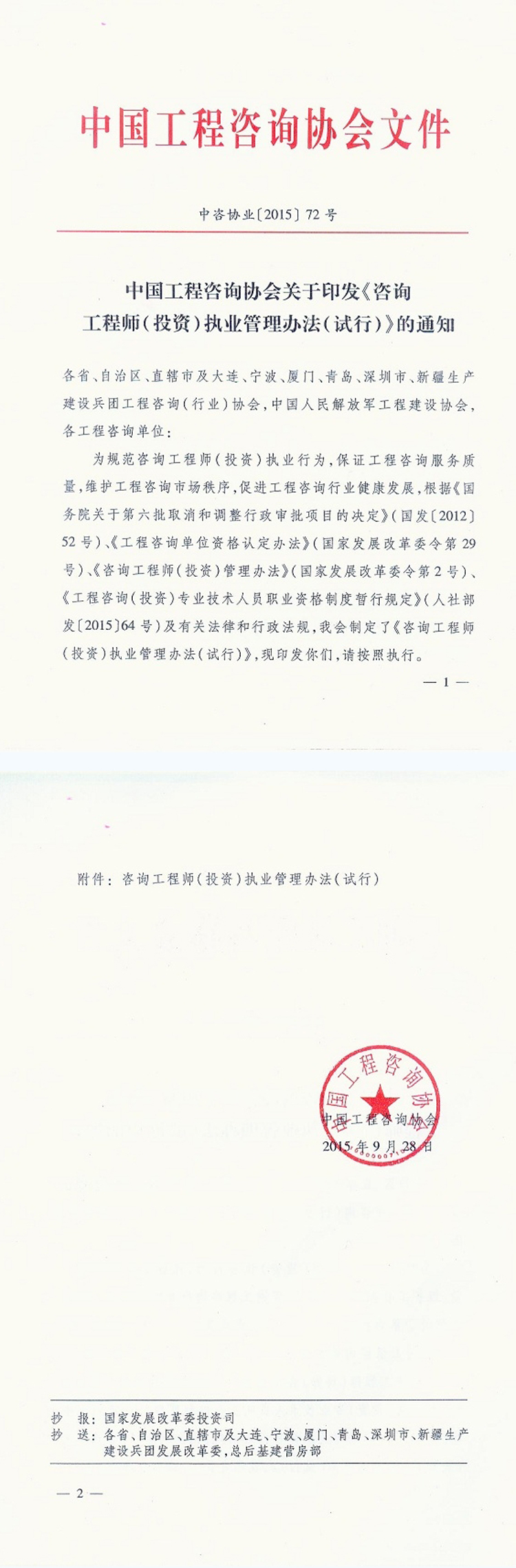 第一条 为规范咨询工程师(投资)执业行为,保证工程咨询服务质量,维护工程咨询市场秩序,促进工程咨询行业健康发展,根据《国务院关于第六批取消和调整行政审批项目的决定》(国发〔2012〕52号)、《工程咨询单位资格认定办法》(国家发展改革委令第29号)、《咨询工程师(投资)管理办法》(国家发展改革委令第2号)、《工程咨询(投资)专业技术人员职业资格制度暂行规定》(人社部发〔2015〕64号)及有关法律和行政法规,制定本办法。