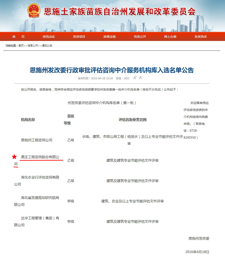【经营成果】我司入围恩施州发改委行政审批评估咨询中介服务机构库