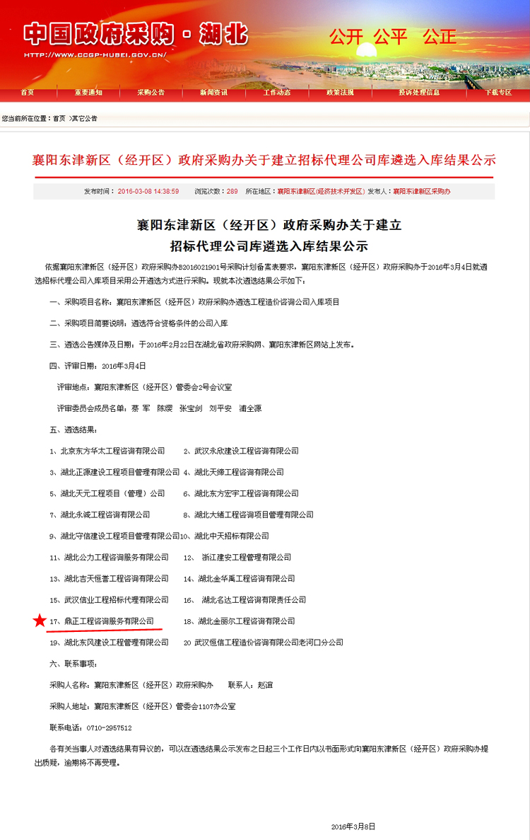 【经营成果】我司入围襄阳东津新区(经开区)政府采购办招标代理公司库