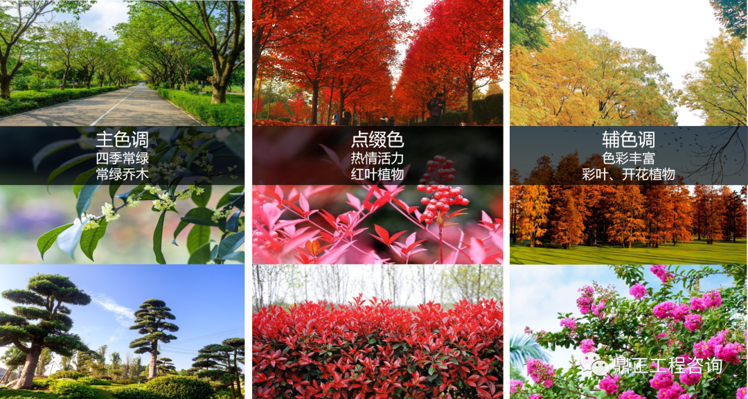 在“生态园区”的理念下,以常绿色系为背景色,并以有色系植物来进行层次的丰富,形成色彩缤纷靓丽,四季有花的景观风貌。