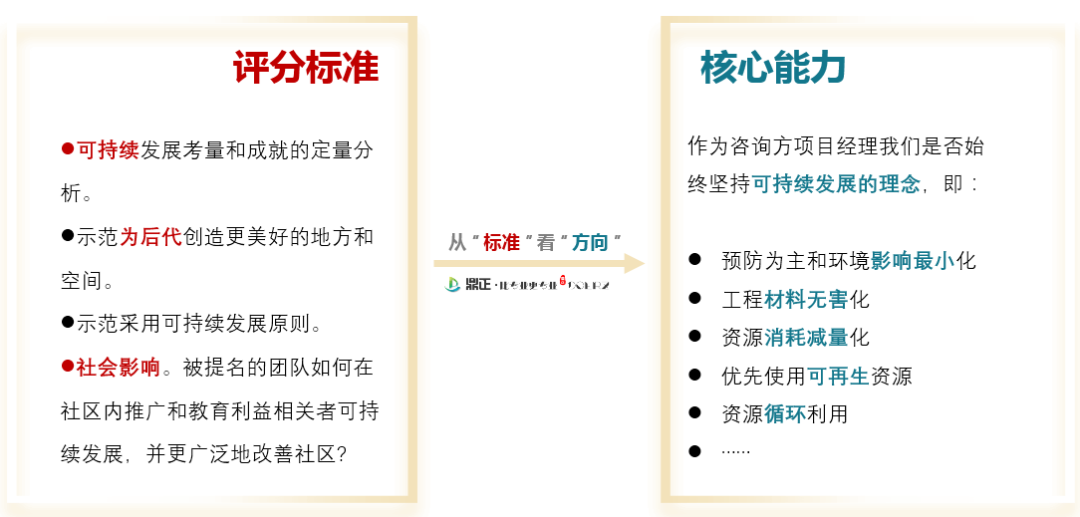 通过此次评奖申报过程中的思考与体会,我们想从RICS中国奖评分标准谈谈项目经理的努力方向。无论是投资决策咨询、规划设计,还是政府采购与招标代理、工程造价咨询、工程监理及项目管理咨询的项目经理,都需要明确优秀的项目管理是什么样的?要实现这些成果需要培养并精进哪些核心能力?