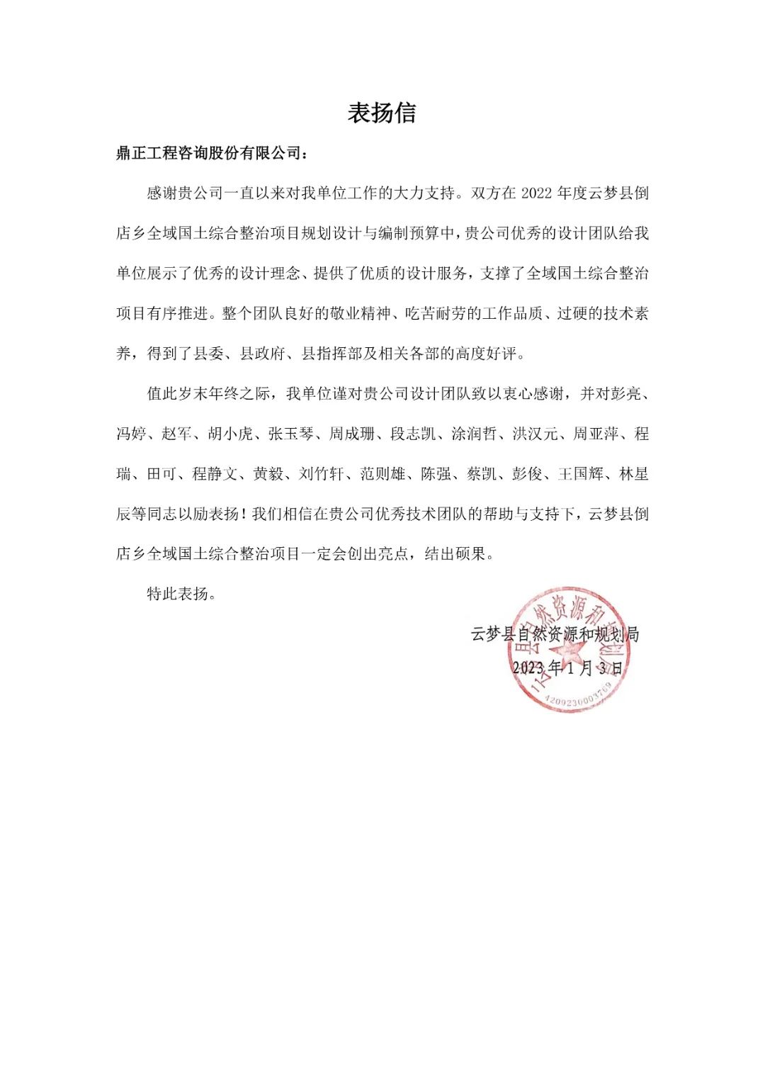 在2022年度云梦县倒店乡全域国土综合整治项目规划设计与编制预算过程中,项目团队向业主展示了优秀的设计理念,提供了优质的设计服务,有条不紊地推进项目进行,高质量地完成了项目相关报规报批节点,获得县委、县政府、县指挥部及相关各部高度好评。本项目规格高、要求严格,在接到任务后,立即成立了项目组,多次深入现场调研,全力推动项目设计咨询工作的开展,从项目建设必要性、建设规模、策划及建设方案、工程实施计划、投资估算及资金筹集、综合效益等方面进行了详尽地分析研究,为项目前期工作的开展发挥了咨询智囊作用。在业主的大力支持下,项目组从立项到实施,克服了诸多困难,展现了优秀的设计咨询能力和资源整合能力,其敬业态度和专业素养给业主留下深刻印象,并获得业主单位给予一致好评。