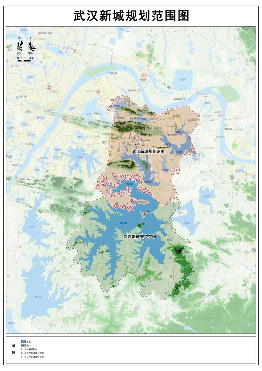 武汉新城规划范围东至鄂咸高速,南至梁子湖,西至京广铁路,北至长江南岸,规划面积约719平方公里;武汉新城管控范围拓展至环梁子湖区域,规划面积约1689平方公里。