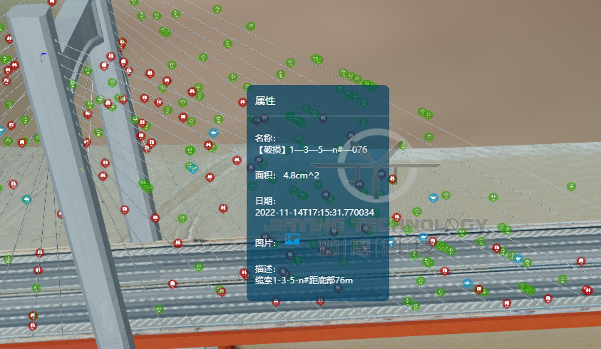 根据拍摄的高清图像重建桥梁三维模型,并定量标示各类缺陷的位置,并且搭建独立的大数据云平台,实现桥梁缺陷与病害的可视化,对桥梁问题进行三维立体化复现,为桥梁安全运行提供数据支撑。