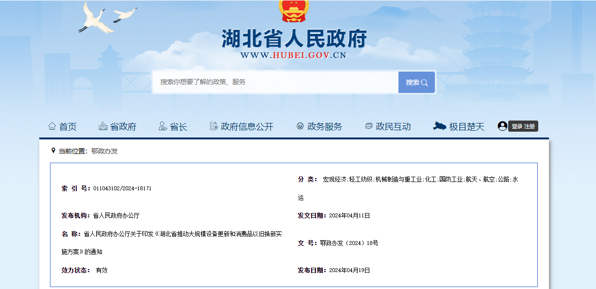 4月19日,湖北省人民政府网发布省人民政府办公厅关于印发《湖北省推动大规模设备更新和消费品以旧换新实施方案》的通知
