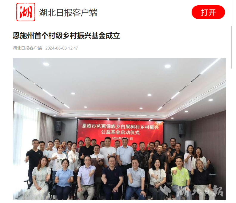 5月31日下午,恩施市芭蕉侗族乡白果树村乡村振兴公益基金在白果树村正式启动,这是恩施州首个村级乡村振兴基金,也是白果树村加快推进乡村振兴的最新创举。