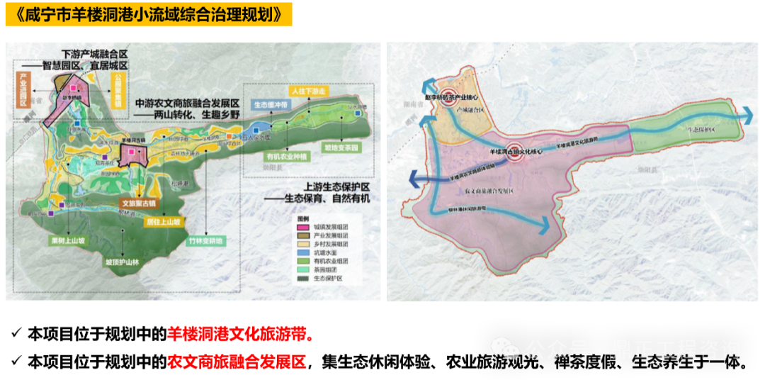 坚持下位规划服从上位规划、下级规划服务上级规划,形成流域治理“一盘棋”。落实上位规划对本项目的定位、功能、治理重点等的相关要求,找准自身工作的侧重点以及与全局工作的结合点,才能保证设计“不偏题”。以本项目为例,上位规划将羊楼洞港小流域划分为三个治理区,本项目位于农文商旅融合发展区和羊楼洞港文化旅游带,因此本项目不仅要关注到水生态、水环境的修复提升,还要考虑流域生态价值的转化及对旅游产业的推动,利用好流域内的茶产业特色以及茶马古镇的历史文化特色,实现生态美与产业绿深度融合。