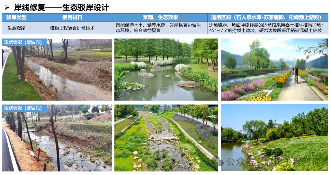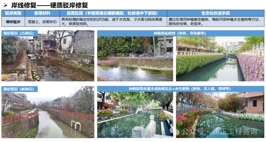 生态方面,打造“羊楼生态廊”,以水提质,修复流域生态,即实施一批驳岸整治、水质提升、生境构建等河道治理措施进行水岸共治。针对水生态的修复,根据不同水体类型提出技术方式;对于岸线的修复,又针对不同的驳岸类型提出适用的整治措施。