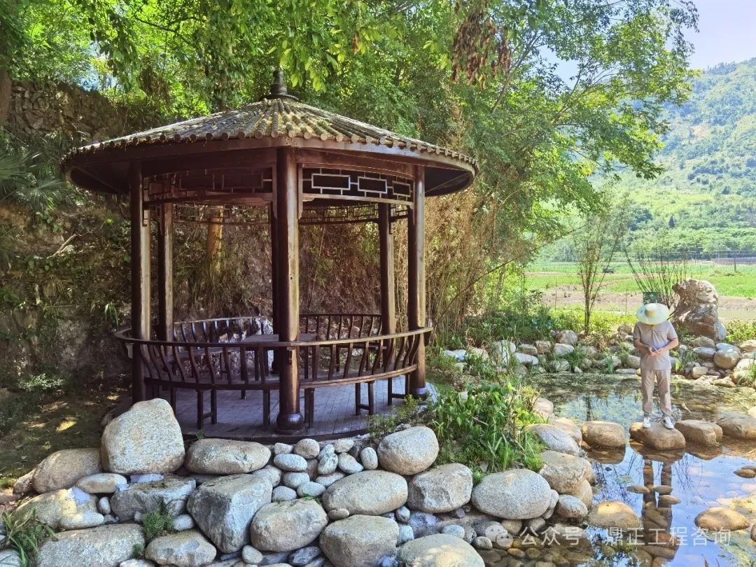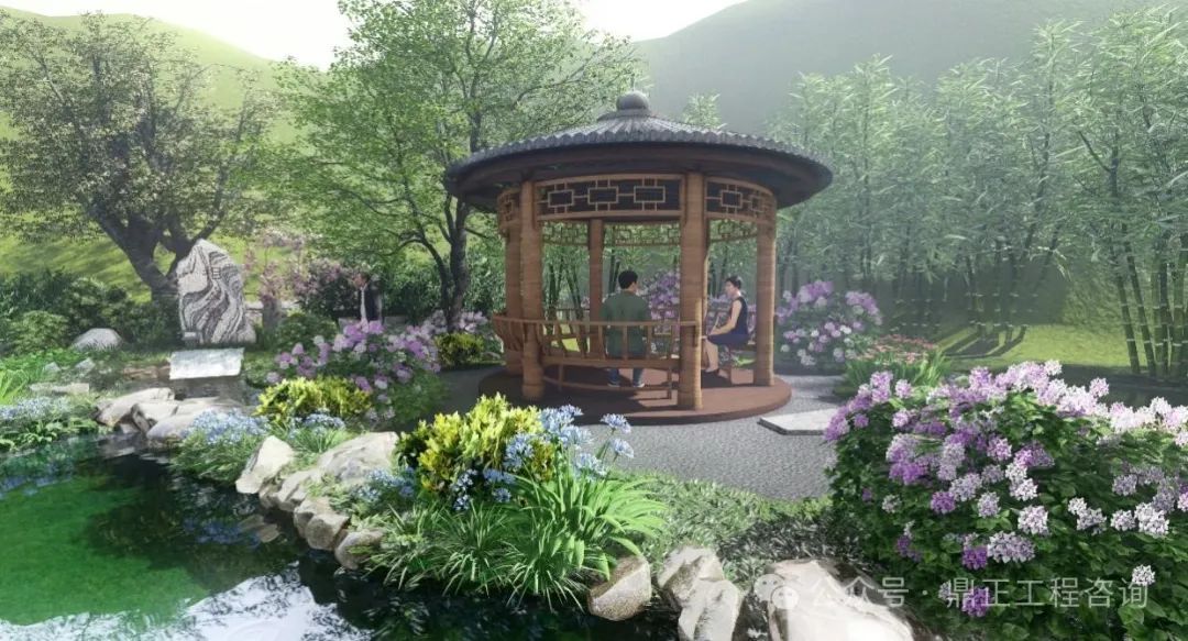 水景观水文化打造:通过深挖相公泉历史文化内涵,进行本地印象提炼。“相公”一词在古代,是妻子对丈夫的称呼,也是君子、生员(秀才、相公)、宰相的另一种叫法。君子爱茶,沏茶品茗,修炼品性,以茶可雅志,茶是象征着尘世的纯洁。设计从自然山水出发,落位于闲情逸致设计基调,泉眼处采用题字景石配上一棵姿态旖旎的红豆,视线端头一幅竹影锦鲤、花木跌水的画面映入眼帘,两侧的树木林立,开合有致,整个节点的中心是一座圆顶茶亭,在亭中,一壶清茶问道,仿佛拉近了古今往事,也增加了场地的记忆,呈现出 “千年古树频招手,万年清泉溢清香”的意境。
