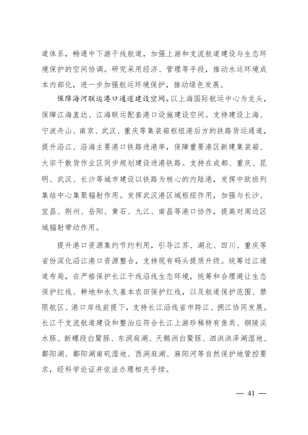 以上海国际航运中心为龙头,保障江海直达、江海联运配套港口设施建设空间。支持建设上海、宁波舟山、南京、武汉、重庆等集装箱枢纽港后方的铁路货运通道,提升沿江、沿海主要港口铁路进港率,保障重要港区新建集装箱、大宗干散货作业区同步规划建设进港铁路。