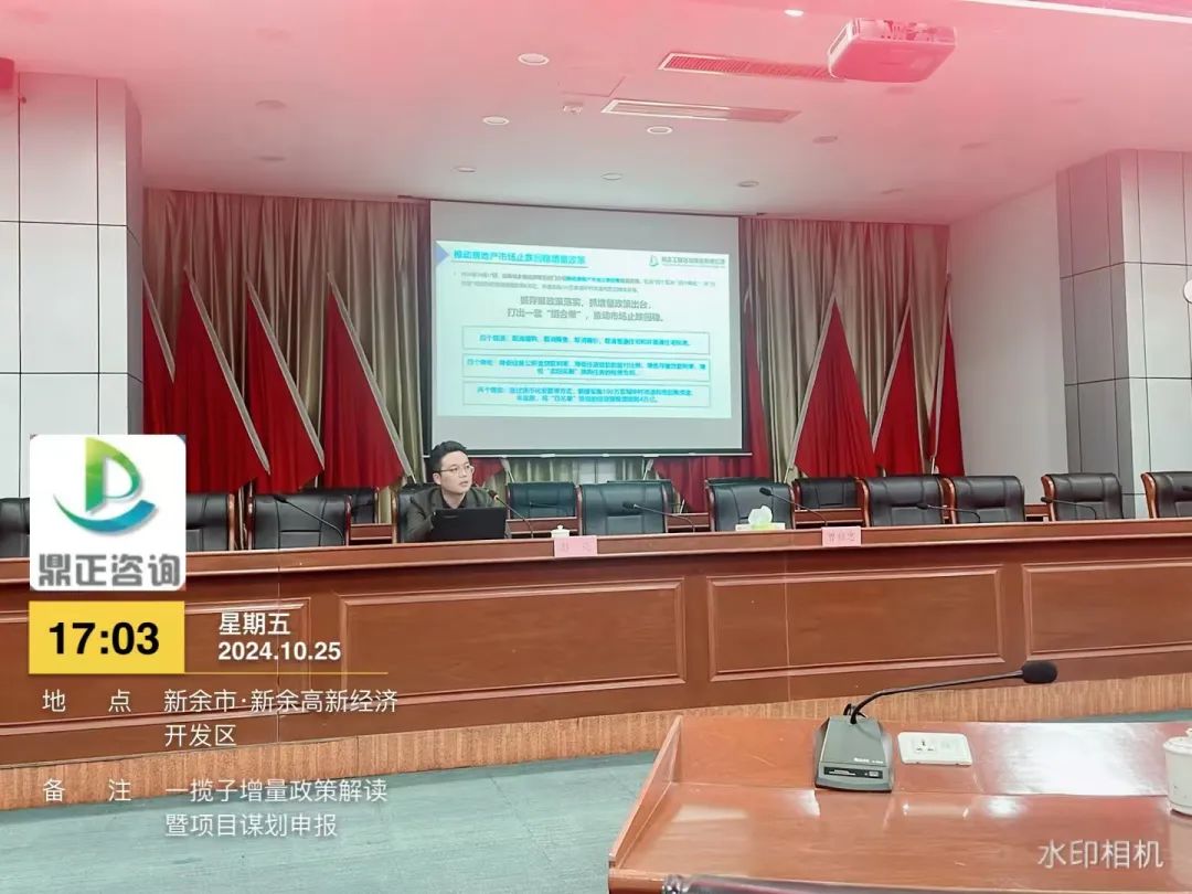 自9月下旬以来,国务院等多部门密集发布了一揽子增量政策,并引发了社会各界的广泛关注。为抢抓增量政策窗口期,提升地方政府项目谋划储备质量和项目谋划水平,精准扩大有效投资。10月25日,鼎正副总经理彭亮受邀为新余高新区政府作《一揽子增量政策解读暨项目谋划申报》的专题培训。