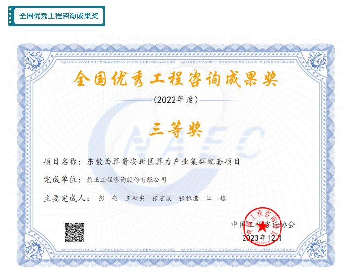 东数西算贵安新区算力产业集群配套项目荣获全国优秀工程咨询成果奖三等奖。