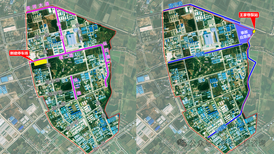 项目概况:本项目总投资1.76亿元,建设内容为园区道路提升5km(道路硬化、路灯、给排水、弱电及电缆敷设);园区防洪排涝及水质提升工程,其中渠道整治9km,王家巷泵站(3.2m³/sx2)新建;敷设供水管道DN300,20000m;敷设供气管道DN300,10000m;新建各类车位278个;园区智能化工程(监控、中控室、设备间等)。