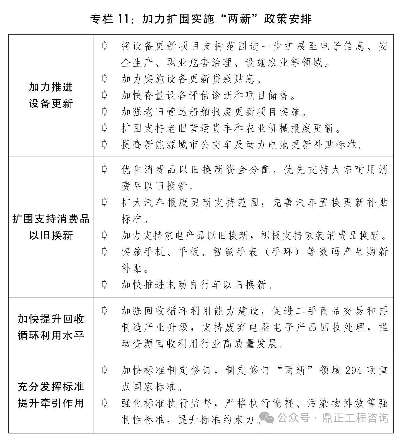 安排超长期特别国债5000亿元支持大规模设备更新和消费品以旧换新,统筹投资、财政、金融等综合性政策,深入推进设备更新、消费品以旧换新、回收循环利用、标准提升四大行动。进一步加大重点领域设备更新项目支持力度,加力实施设备更新贷款贴息,加快存量设备评估诊断和项目储备。进一步支持消费品以旧换新,扩大汽车报废更新支持范围,完善汽车置换更新补贴标准,实施手机、平板等数码产品购新补贴,积极支持家装消费品换新,简化补贴申领和支付流程,完善资金监管机制,严厉打击价格欺诈和违规骗补套补行为。