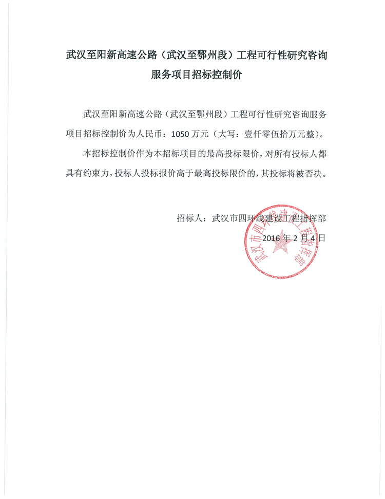 武汉至大悟高速公路工程可行性研究咨询服务项目招标控制价通知