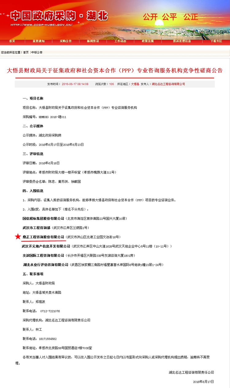 【经营成果】我司入围大悟县财政局关于征集政府和社会资本合作(PPP)专业咨询服务机构