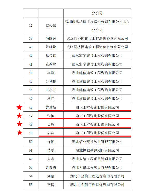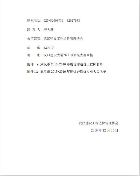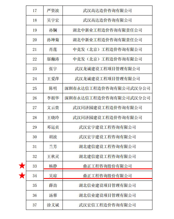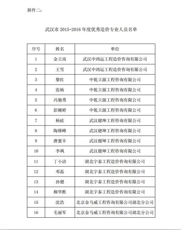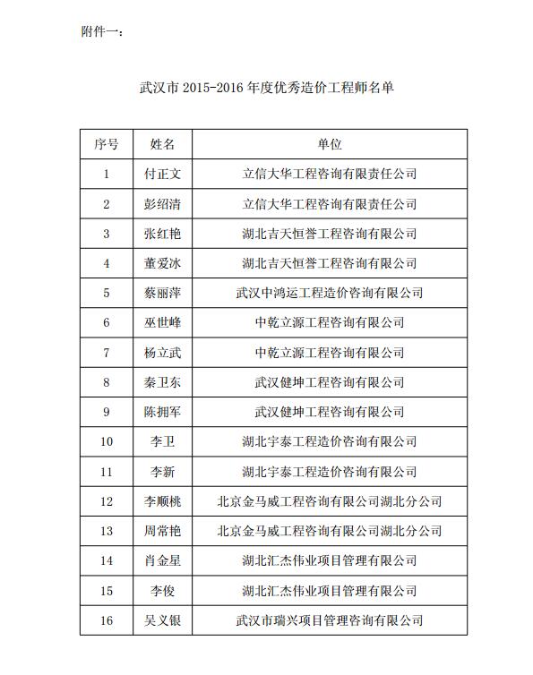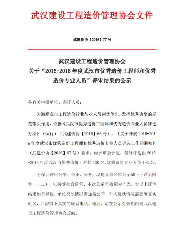 根据武建价协【2016】77号文件公示,我司员工杨静、吴琼荣获2015-2016年度武汉市"优秀造价工程师"称号,黄建新、张恒、吴辉、彭萍荣获2015-2016年度“优秀造价专业人员”称号。此次荣誉的获得,既是对我司同志工作的肯定,也展示了鼎正人爱岗敬业、争创一流的精神风貌。鼎正公司将以更加昂扬的斗志和饱满的热情,服务于企业、服务于社会!