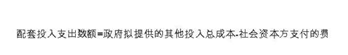 第二十二条 配套投入支出责任应综合考虑政府将提供的其他配套投入总成本和社会资本方为此支付的费用。配套投入支出责任中的土地等实物投入或无形资产投入,应依法进行评估,合理确定价值。计算公式为: