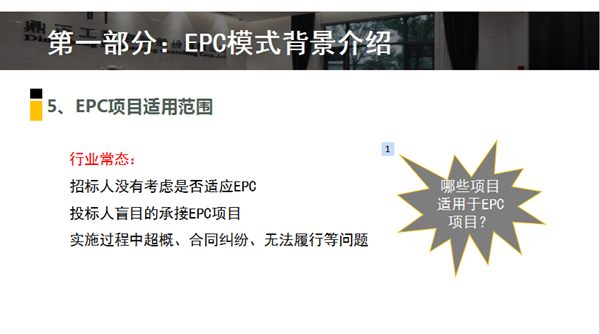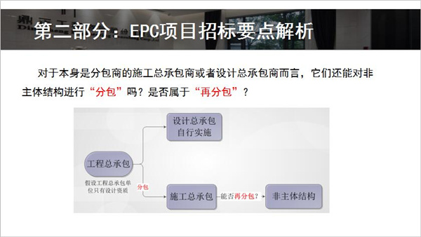 下午,采购与招标代理事业部的潘胜强带来了《EPC项目招标实务》的主题培训。潘胜强首先介绍了EPC模式的背景,包含工程总承包的主要模式,EPC发展状况,EPC项目适用范围,招标流程等多方面内容。随后对EPC项目招标要点进行了解析,结合相关政策文件对工程总承包发包阶段和条件、资格条件的设置、EPC项目前期单位是否可以参与后期投标、合同计价方式、分包原则进行了详细的解读。