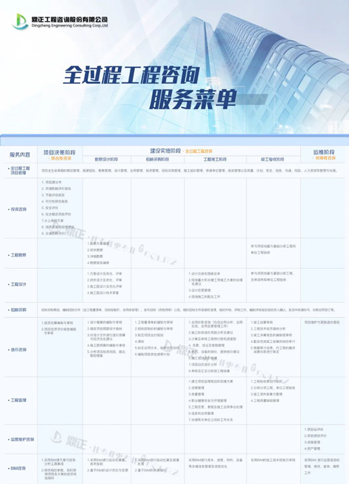鼎正咨询资质资信及业务能力已覆盖工程咨询全产业链,可提供全过程工程咨询、PPP全生命周期咨询、项目策划、工程投资咨询 、土地利用规划、城乡规划、工程设计、工程监理、招标代理、政府采购、工程造价咨询、BIM咨询等服务。