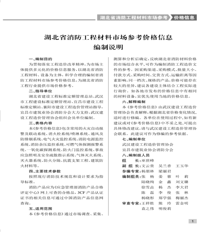 此举是我省贯彻落实工程造价改革精神的具体举措,是转变服务方式,提高消防工程质量和经济性,完善工程造价计价依据体系的具体探索,为消防工程参建各方编制造价文件提供了参考。其中创新采取的湖北省、武汉市、宜昌市、襄阳市建设工程标准定额(造价)管理机构指导,两个行业协会联合编制的工作方法,在全国尚属首次,实现了优势互补,打造了政府指导下的,“协会与协会联合,服务行业高质量发展”样板。《参考价格信息》由武汉建设工程造价管理协会发布。